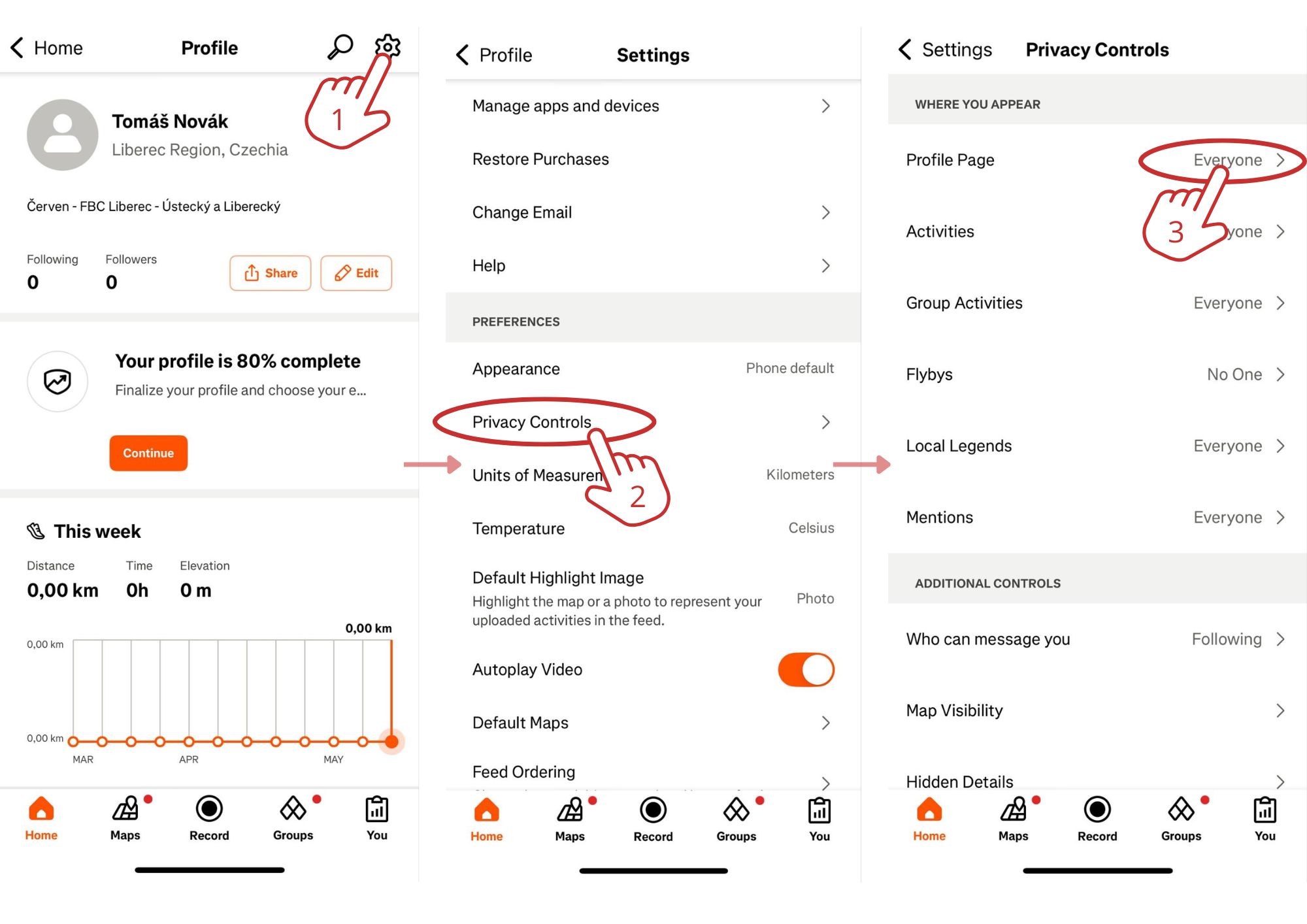 V aplikaci Strava na svém profilu přejdi do Nastavení → Ochrana soukromí → Profilová stránka a Aktivity → viditelná pro všechny.